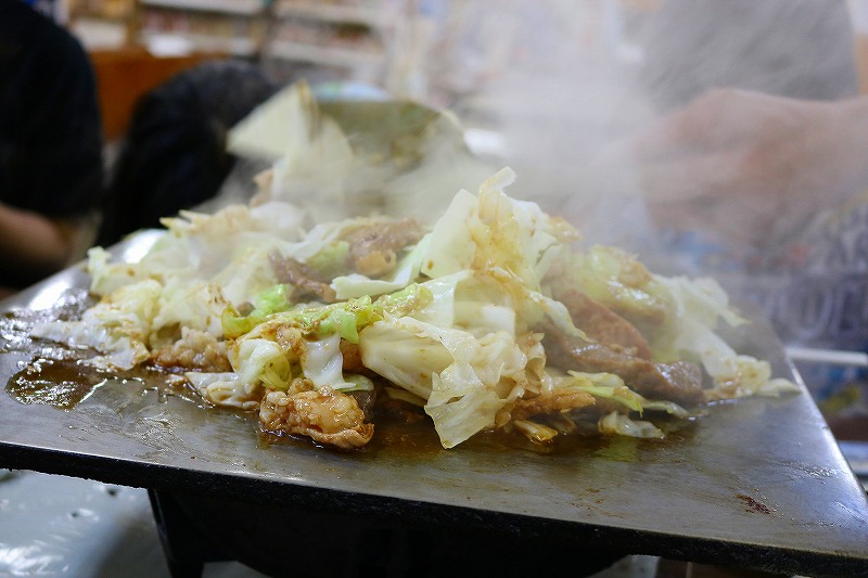 治さんが熱した鉄板の上に無造作に山盛りキャベツと肉を投入。