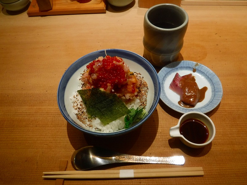 ①最初に黄身醤油をお出ししますので、わさびを溶いて余すことなく丼にかけてお召し上がりください。