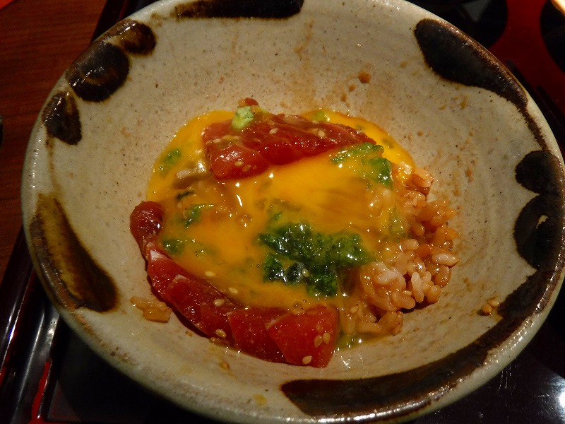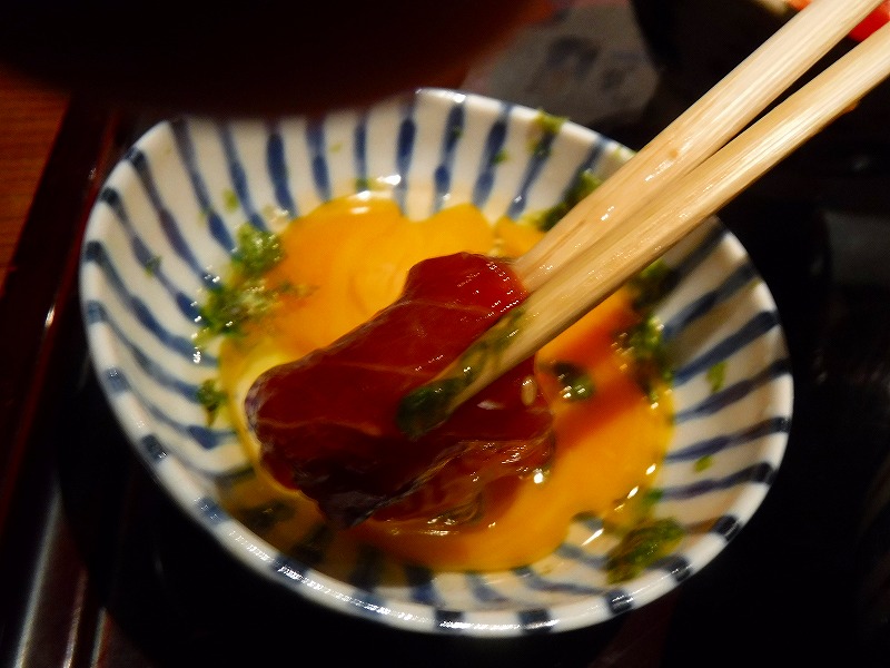 黄身をかき混ぜて、マグロのヅケをつけていただきます。