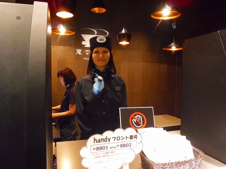 ロボットは女性姿のもの、恐竜型、人形型、ポーターロボット、卓上ロボットなど館内に約80台を配備し、人間の従業員はベッドメークや監視カメラ要員など十数人のみ。