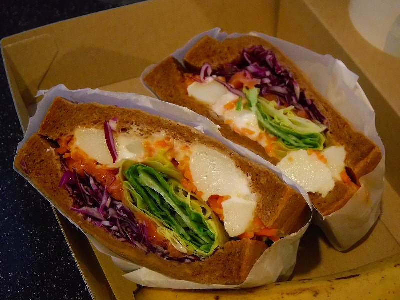 サンドイッチは中にレタスやにんじん、じゃがいもとサーモンが入っています。