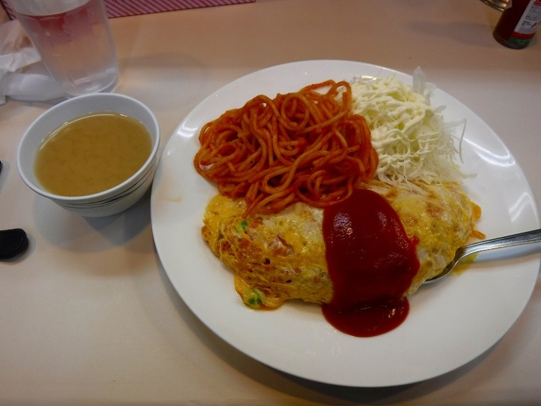ケチャップたっぷりかかってて、ナポリタンもケチャップで味付け。